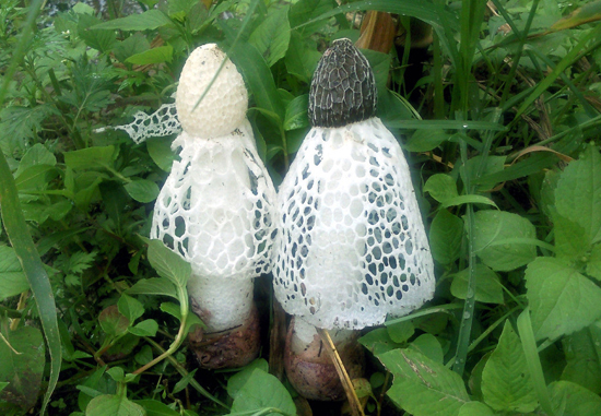 幼担子果菌蕾呈圆球形,具三层包被,外包被薄,光滑,灰白色或淡褐红色;中层胶质;内包被坚韧肉质。成熟时包被裂开,菌柄将菌盖顶出,柄中空,高15-20cm,白色,外表由海绵状小孔组成;包被遣留于柄下部形成菌托;菌盖生于柄顶端呈钟形,盖表凹凸不平呈网格,凹部分密布担孢子;盖下有白色网状菌幕,下垂如裙,长达8cm以上;孢子光滑,透明,椭圆形,3-3.5×1.5-2μ。